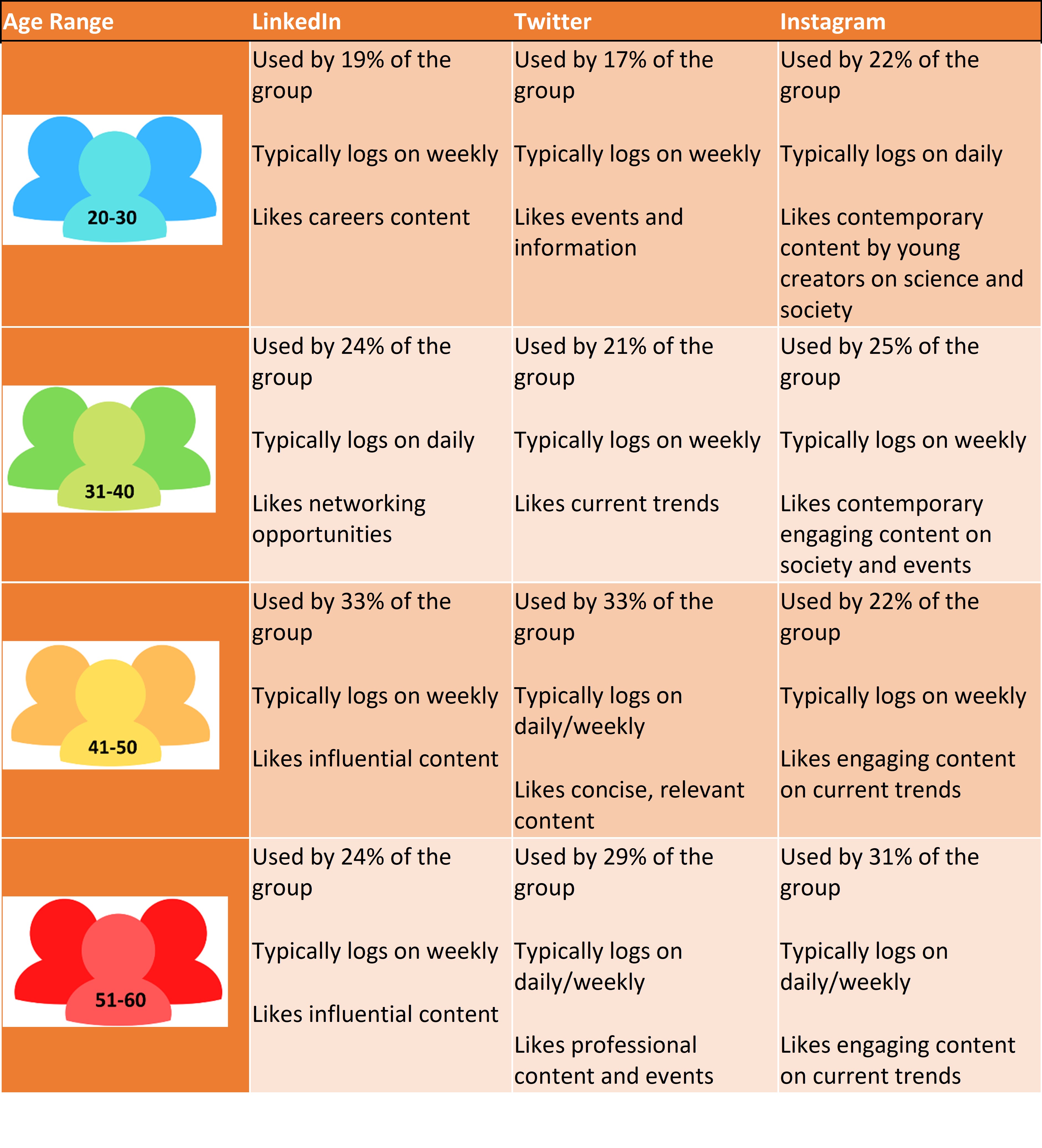 Other age groups typically interact on Instagram on a weekly basis and engage with content of particular interest both personal and professional. Overall, the expectation of users is that this informal platform should be enjoyable and entertaining to use.